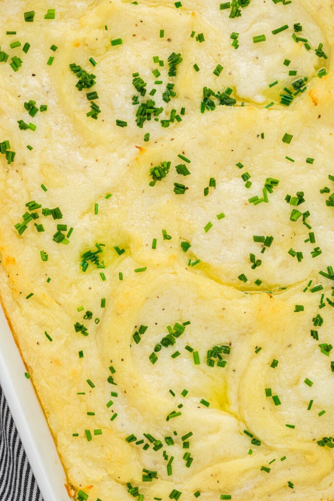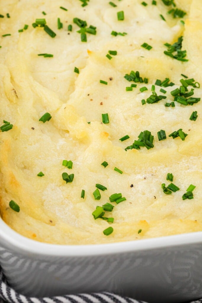 You can make these potatoes one to two days in advance, cover and refrigerate them, and then bake them to reheat them before serving. The added melted butter on the potatoes when you bake them makes a beautiful golden top with slightly crispy edges. I have done this many times, and then I’m not worried about cooking and mashing potatoes on a busy night for dinner or for a holiday meal, just heat them in the oven for 30 minutes, and they are ready to go.