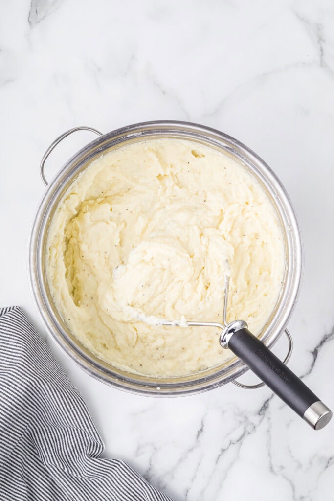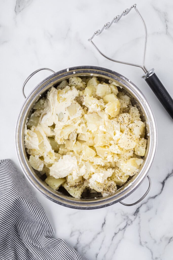 Step 2. With a potato masher, mash the potatoes with the seasonings to remove lumps. Warm the cream in the microwave for 30-60 seconds and add it to the potatoes, continuing to mash and stir until you reach the desired consistency. Use a spatula to incorporate the edges to make sure the potatoes are evenly seasoned.