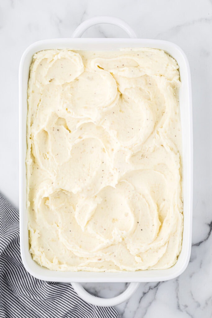 Step 3. Transfer the potatoes to an ungreased 9×13 pan. I like to swirl the potatoes a bit on the top so the melted butter seeps into crevices when baking. Cover and refrigerate for up to 1-2 days until ready to bake (you can bake the potatoes immediately after mashing as well).