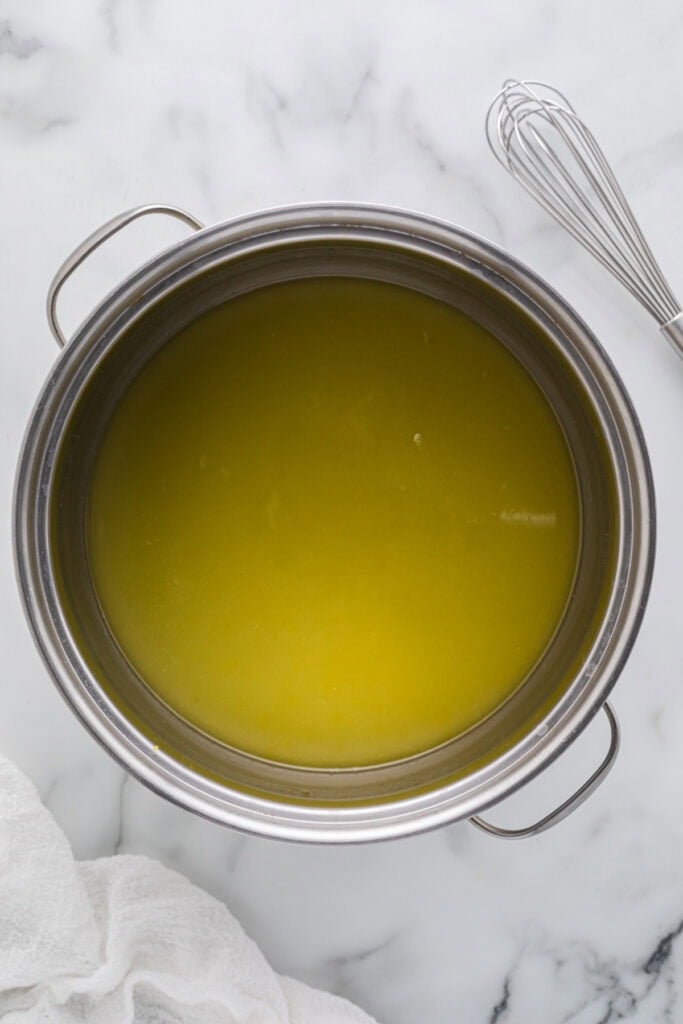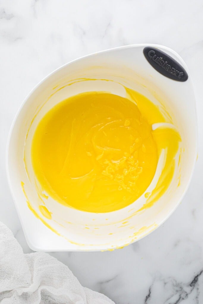 Step 2. Turn the heat to medium-low and add the butter and lemon juice. Stir often, until the butter melts, the mixture is incorporated, and the mixture is warm and just starting to bubble on the edges (not boil).