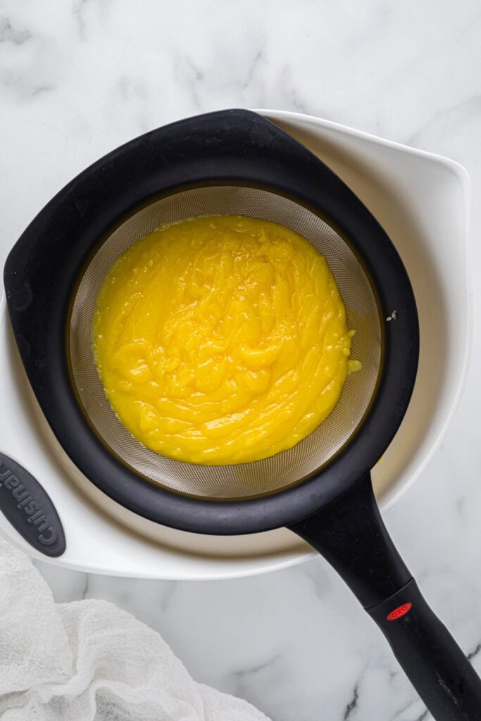 Place a fine-meshed sieve over a medium-sized bowl, and press and strain the curd through the sieve into the bowl to remove any cooked egg bits and lemon zest.
