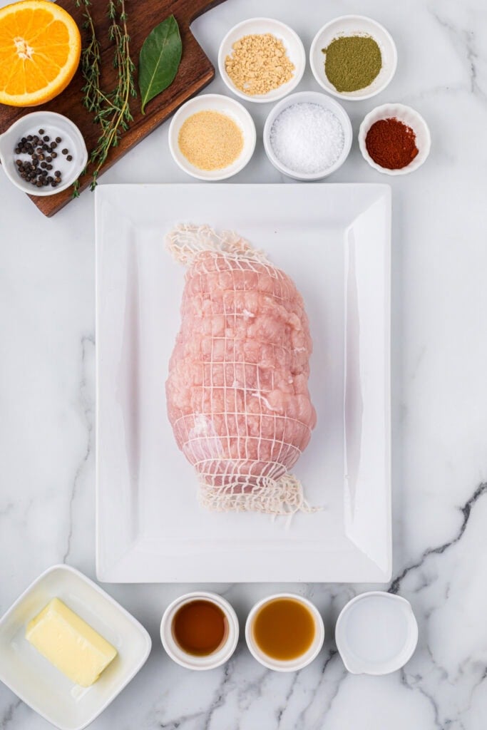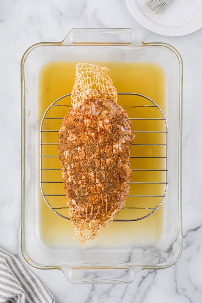 To cook this turkey, I use a 9×13 inch pan, with a small rack inside (an instant pot steamer/roasting rack or trivet). If you don’t have one, you can use a larger roasting pan and rack. With the boneless turkey breast being smaller than a full turkey, the larger roasting pan isn’t really necessary.
