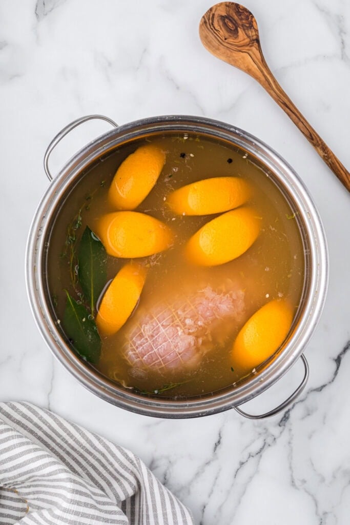 The flavor of the turkey is unmatched. I love the flavor of this turkey, and the huge contributor is the overnight brine. It is so easy and fuss free. You need water, apple cider, maple syrup, kosher salt, an orange, and some herbs. The boneless turkey breast is much smaller than a whole turkey and easily fits with the brine in a large pot. Cover it with a lid and stick it in your fridge overnight or let it brine all day before roasting.