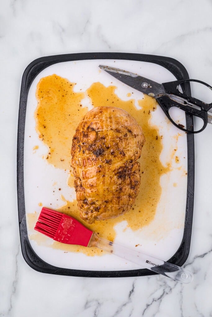 Step 3. Bake for 1 hour and 15 minutes. Remove the turkey from the oven and, using kitchen scissors, cut the netting from the turkey. In a small bowl, whisk together the melted butter and pure maple syrup, and brush the maple butter on the turkey. Return to the oven and bake an additional 30-45 minutes, until the turkey has reached 165 degrees Fahrenheit in the center of the turkey breast, brushing with the maple glaze 1-2 times more while baking.