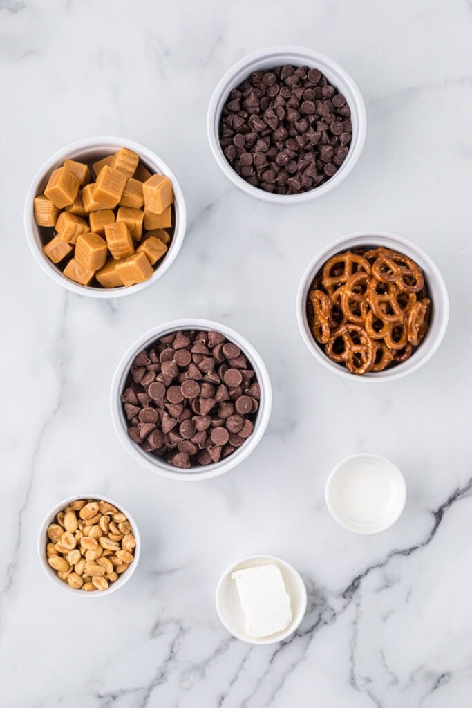 I love how easy this bark is to make. The chocolate and caramel each are melted in the microwave in 1-2 minutes and you just pour it out on to a baking sheet and layer the ingredients. It comes together in minutes and then needs about 2 hours to set. If you’re baking holiday treats, this is a great choice to have in your selection because it is just so easy.