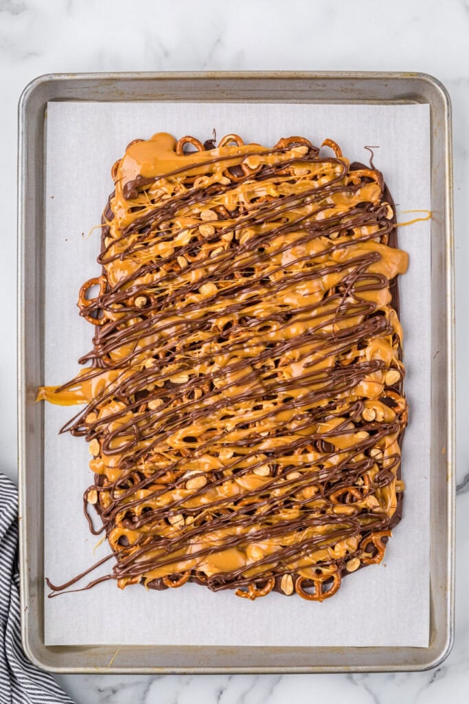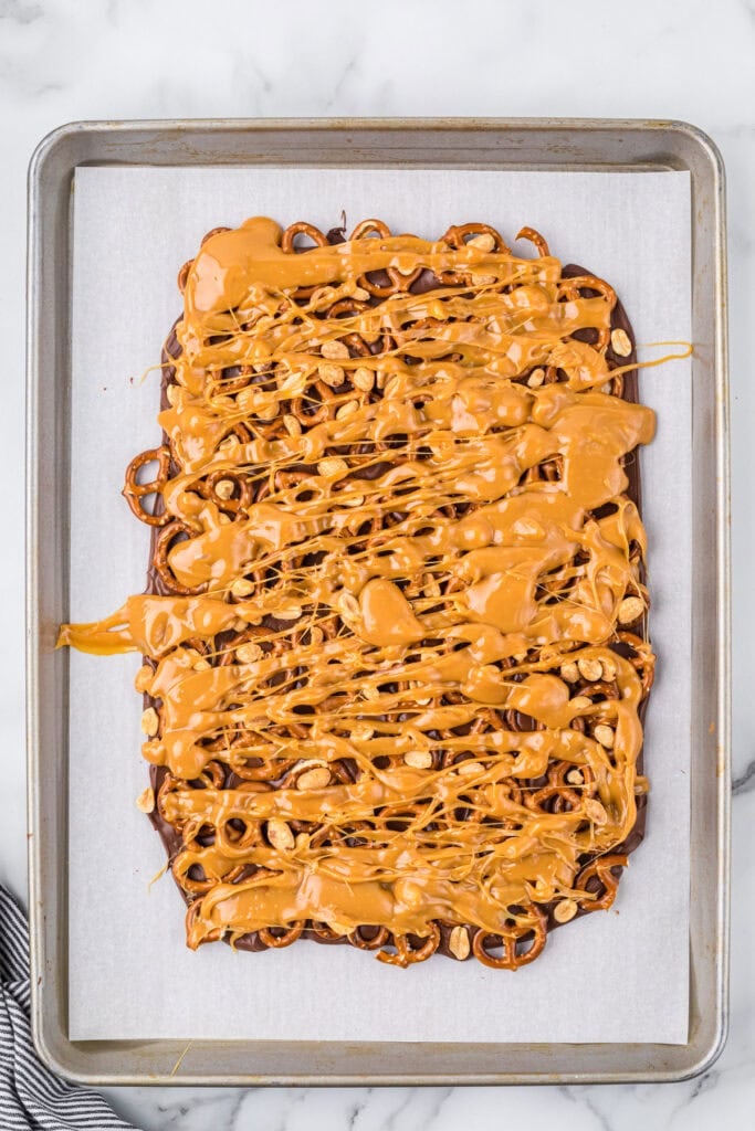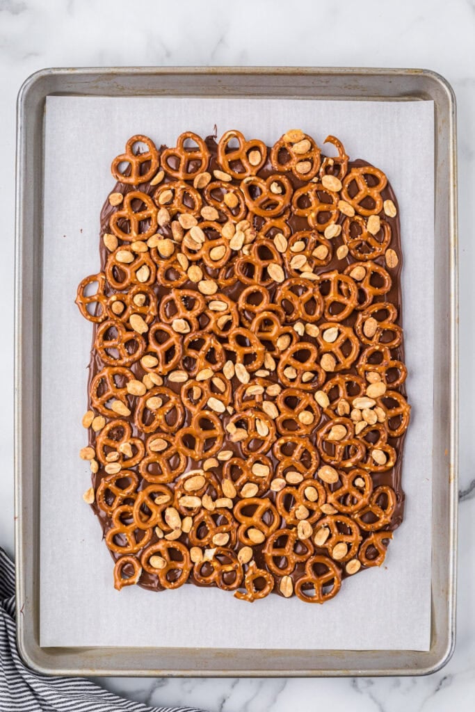 Set 1/3 cup of the chocolate aside and immediately spread the remaining chocolate onto the prepared baking sheet. The chocolate bark should be about ¼ inch thick. Spread the pretzels over the chocolate to cover it. Press the pretzels gently into the chocolate as you place them. Sprinkle the peanuts over the pretzels.