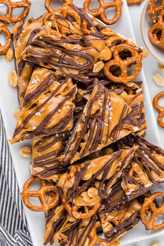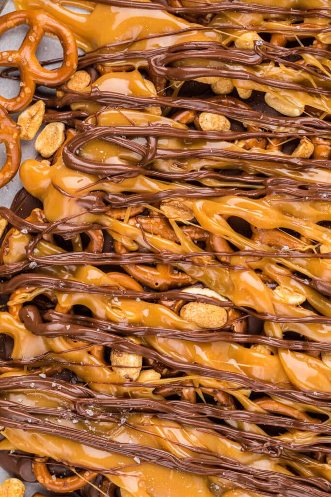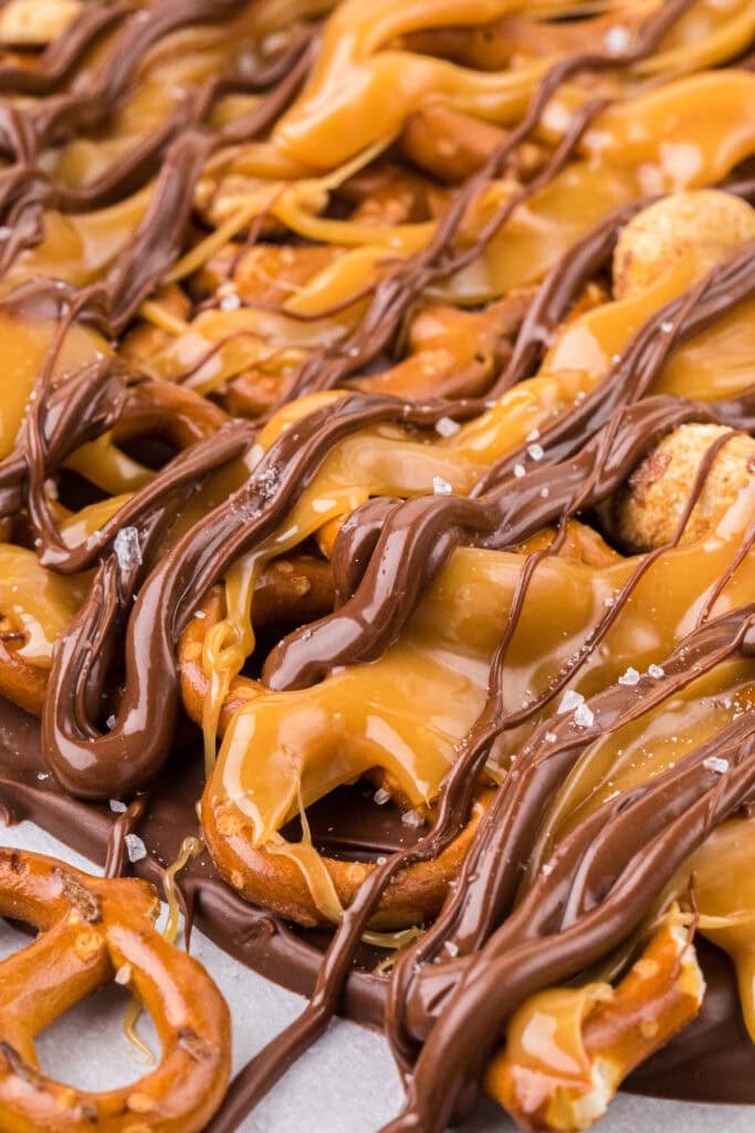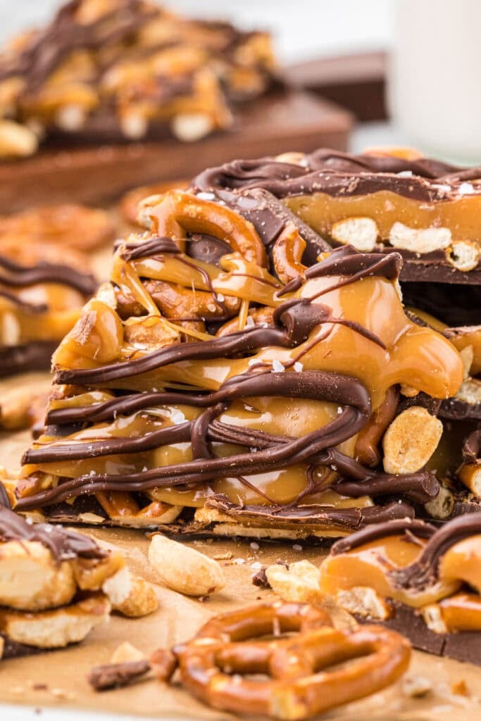 Honestly, what’s not to love? The chocolate caramel pretzel combination is so good. I love sweet-and- salty snacks, and this is the ultimate sweet-and-salty treat. The chocolate and caramel together are so yummy and I love the salty crunchy contrast of the pretzels and peanuts. The finish of coarse sea salt really elevates the bark. Don’t skip or skimp on the salt, it tastes better with it.