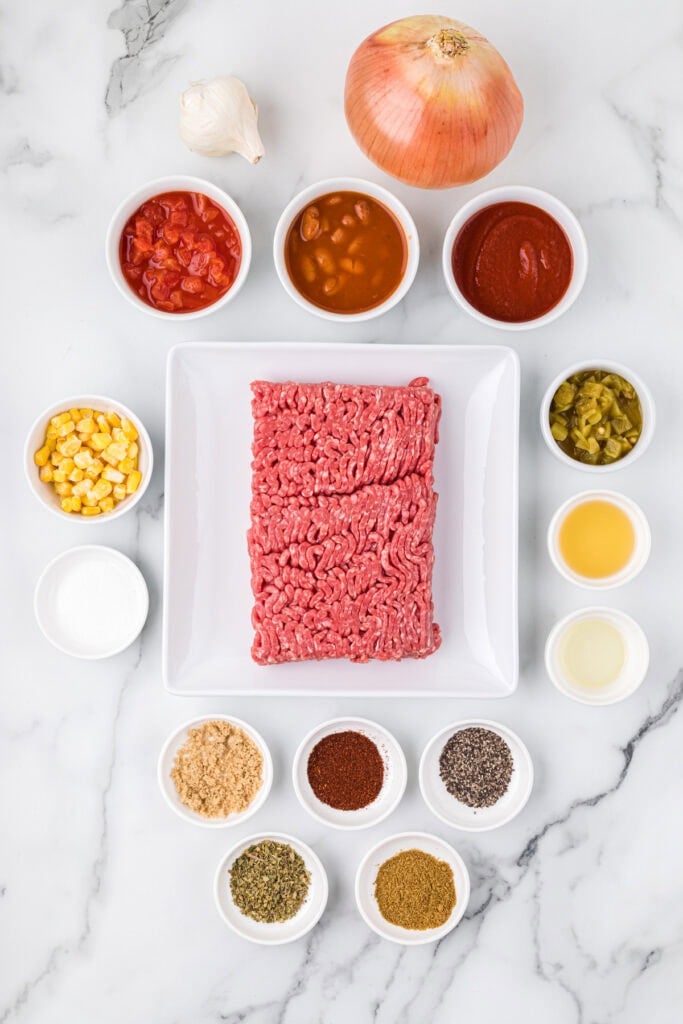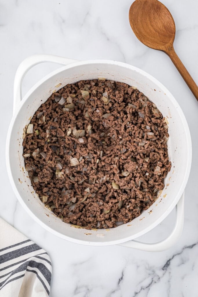 Step 1. In a 12-inch cast iron or other oven-safe skillet, brown the ground beef and cook the chopped onion and minced garlic. Add the chili powder, salt, cumin, oregano, brown sugar, and pepper.