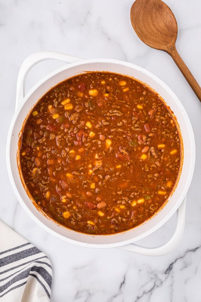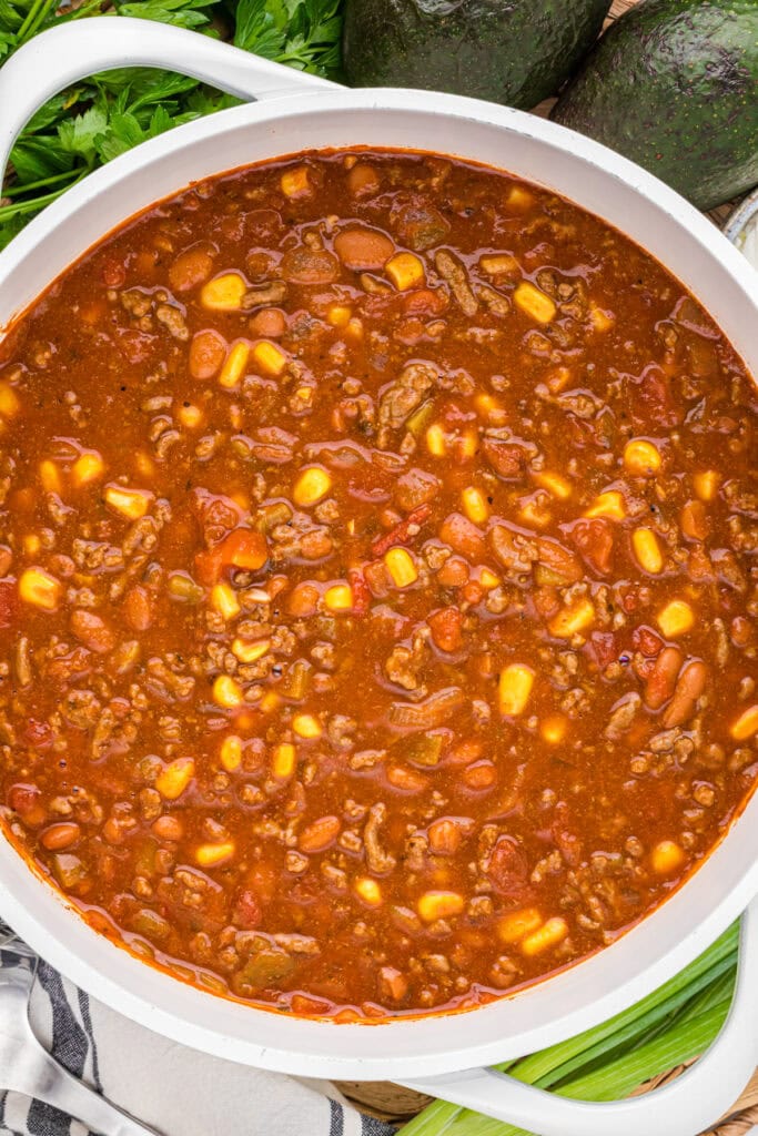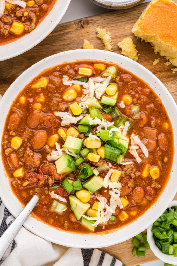 I love how fast homemade chili comes together. Once you brown the beef, you just add the seasonings, tomato sauce, tomatoes, beans, broth, green chiles, and corn. This is a perfect one-pot meal for busy weeknights or for gatherings on the weekends. We make this chili throughout the year. It’s a fun Halloween night or game night dish, or a cozy dinner on a cold, busy day.