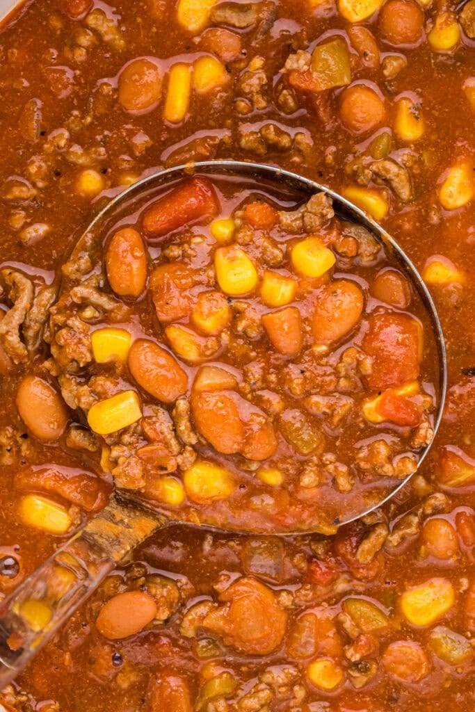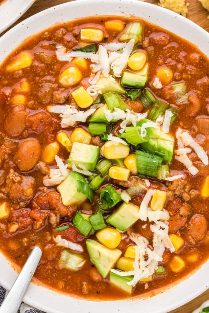 Just last night, I won first place in a chili contest with this Chili Recipe with Corn. We love this chili. It is the perfect one-pot meal. It makes a great cozy dinner on a busy weeknight, or easily feeds a crowd for game nights, Halloween, or other fall and winter gatherings. Made with ground beef, chili beans, pinto beans, green chiles, broth, tomatoes, tomato sauce, seasonings, and corn, we love how the slight sweetness of the corn balances with the flavorful seasoned chili.