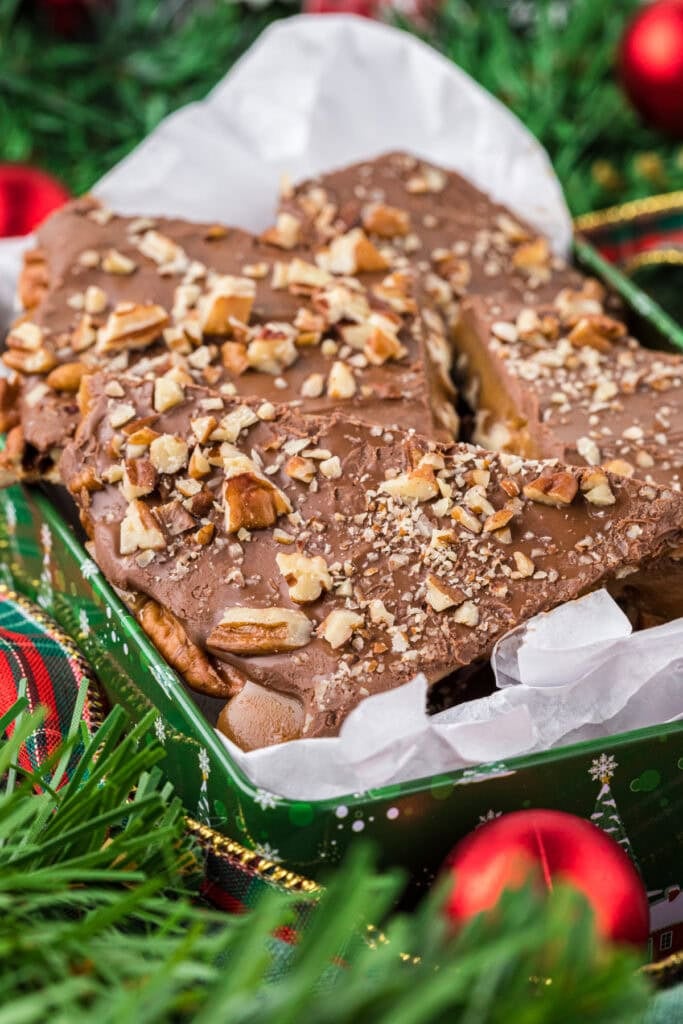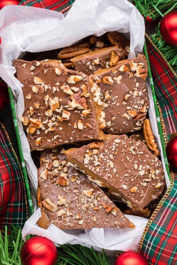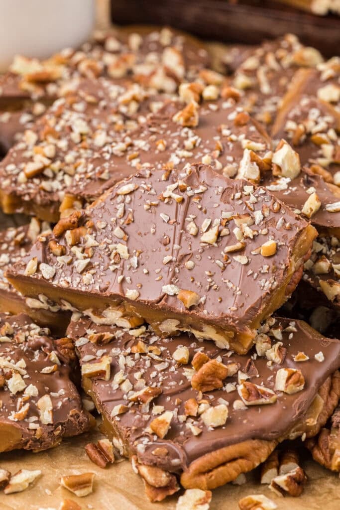 If I could only choose one dessert to make at Christmas, it would be this Chocolate Butter Toffee with Pecans. Also called Buttercrunch Toffee, it is made with just butter, sugar, vanilla, and salt, then covered in chocolate and pecans. The crunchy, buttery toffee with the creamy chocolate and pecan crunch is so addictive. It makes great holiday gifts in bins or in cookie boxes.