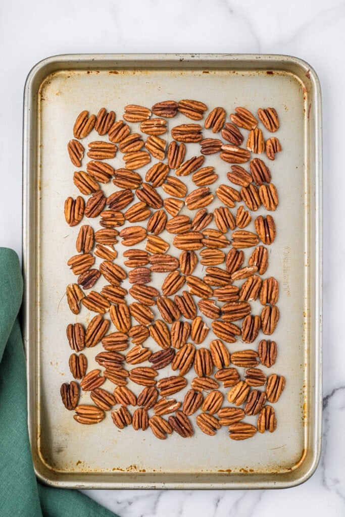 Step 1. Grease a 10×15 pan with butter. Spread pecan halves on the pan, within about an inch of the edge of the pan. Finely chop the remaining pecans and set aside.