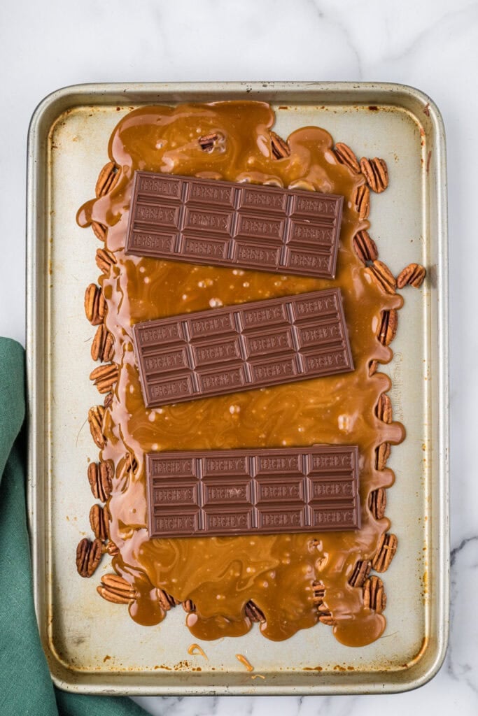 Step 4. Allow the toffee to cool for 2-3 minutes, then place the three chocolate bars on the toffee and let it sit for 3-5 minutes.