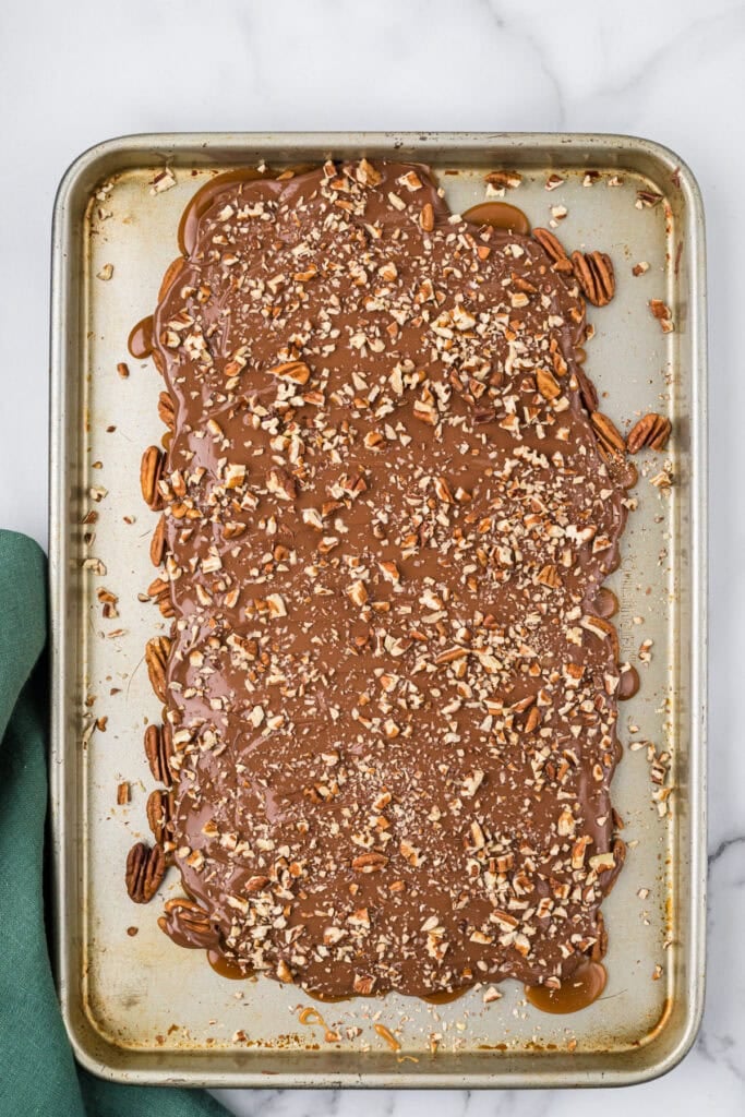 Step 5. Using a spatula, spread the chocolate over the toffee. I like using an angled spatula to make sure the chocolate is evenly spread. Sprinkle the desired amount of chopped nuts over the chocolate.