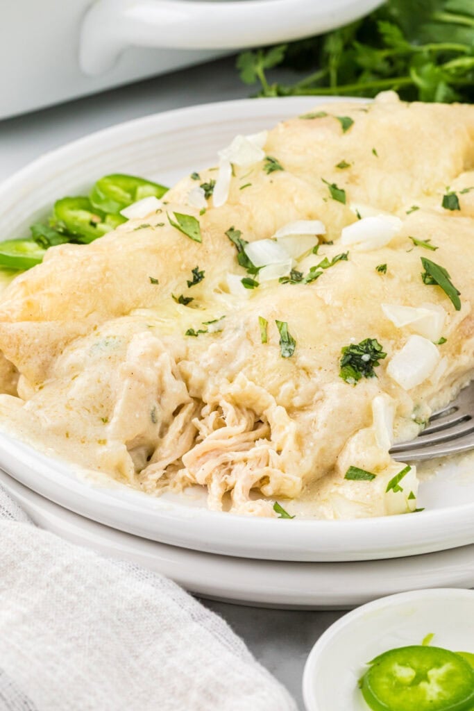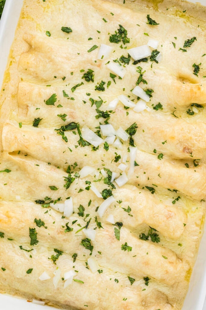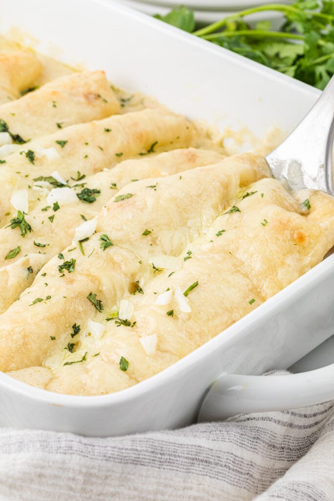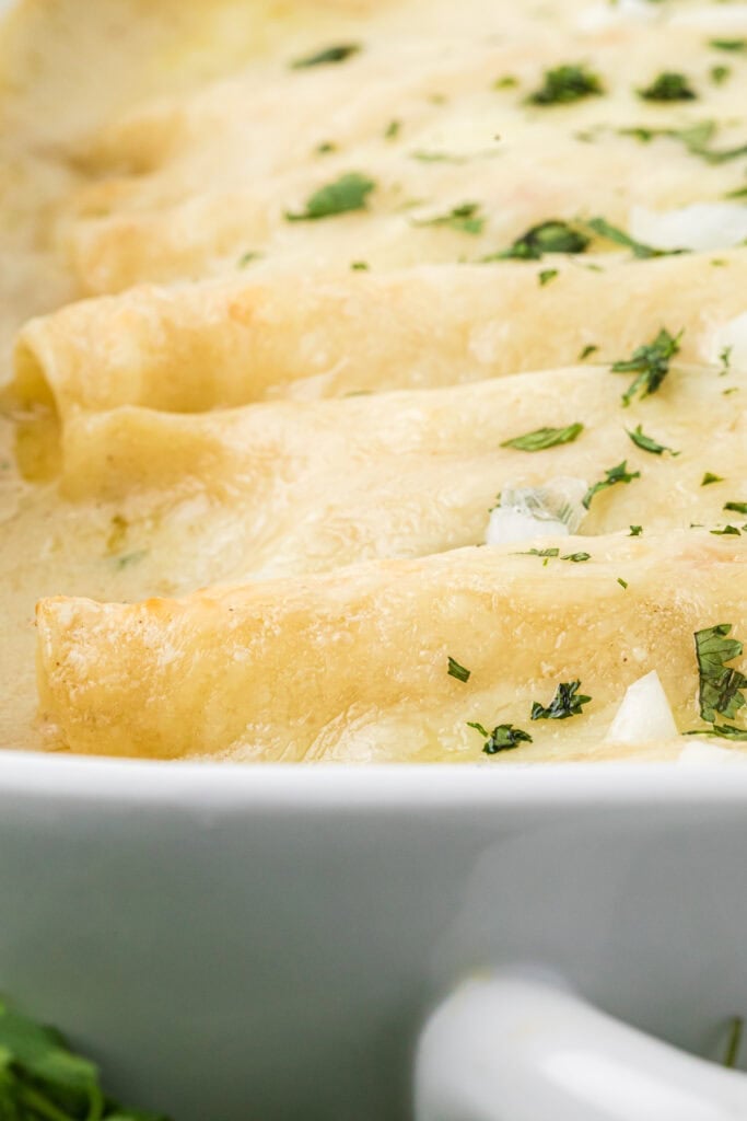 These Creamy Chicken Enchiladas with Sour Cream have an irresistible, creamy homemade sour cream white sauce that makes these our favorite enchiladas. They are incredibly creamy and cheesy with a flavorful, tender chicken filling. The enchiladas are easy to prepare and make an extra comforting weeknight meal, or a perfect entree for weekend entertaining.