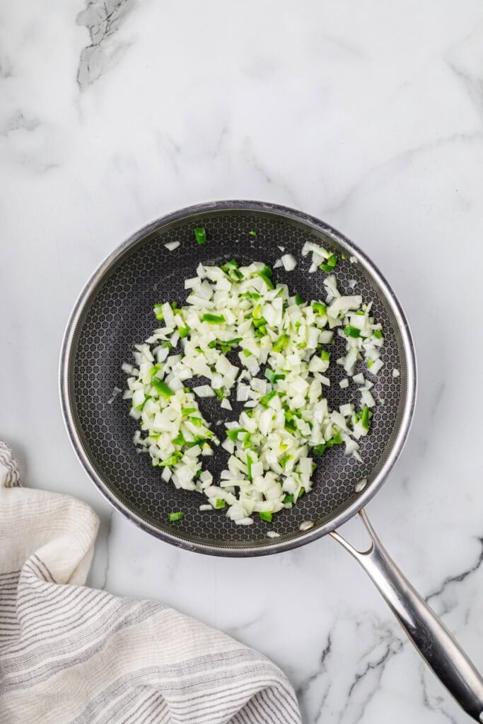Step 1. In a medium-sized skillet over medium-low heat, melt 1 tablespoon of butter. Sauté the onion and jalapeño for 5-7 minutes until the onions become translucent. Remove from heat and set aside.