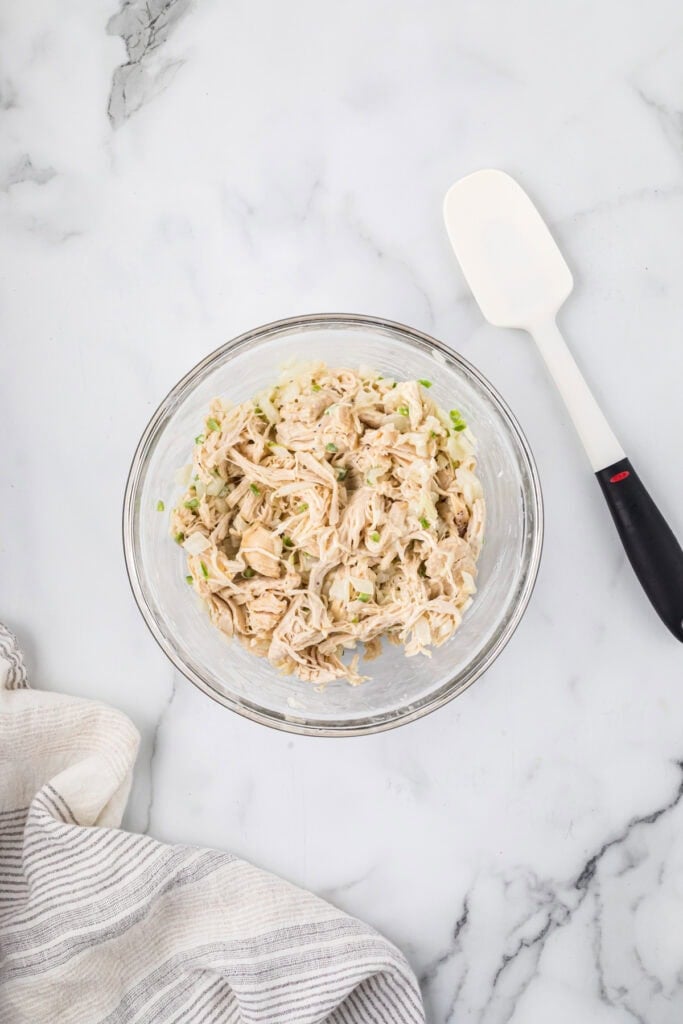 Step 3. In a medium-sized bowl, combine the shredded chicken and onion jalapeño mixture. Stir in 3/4 cup of the sour cream sauce.
