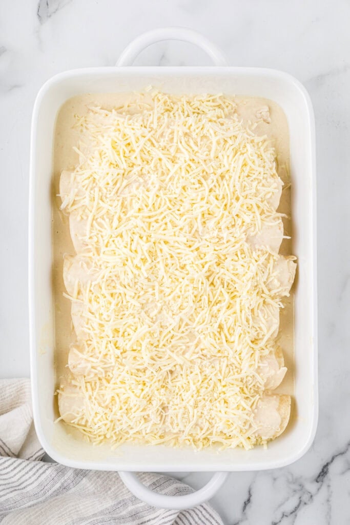 Step 5. Pour the remaining sauce over the filled tortillas and top with the remaining cheese.