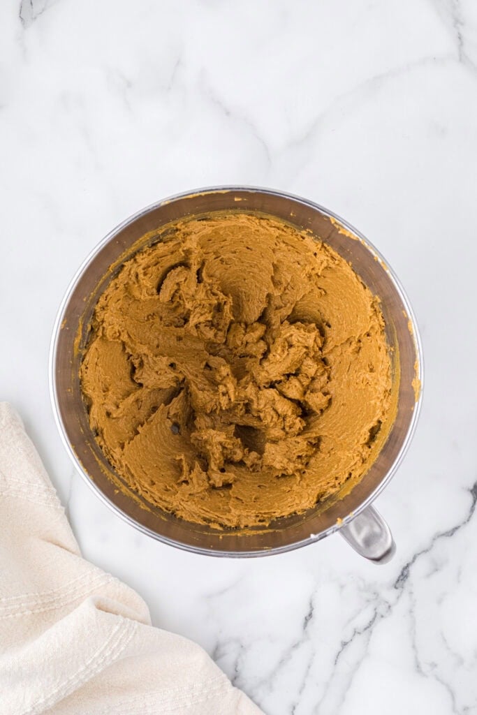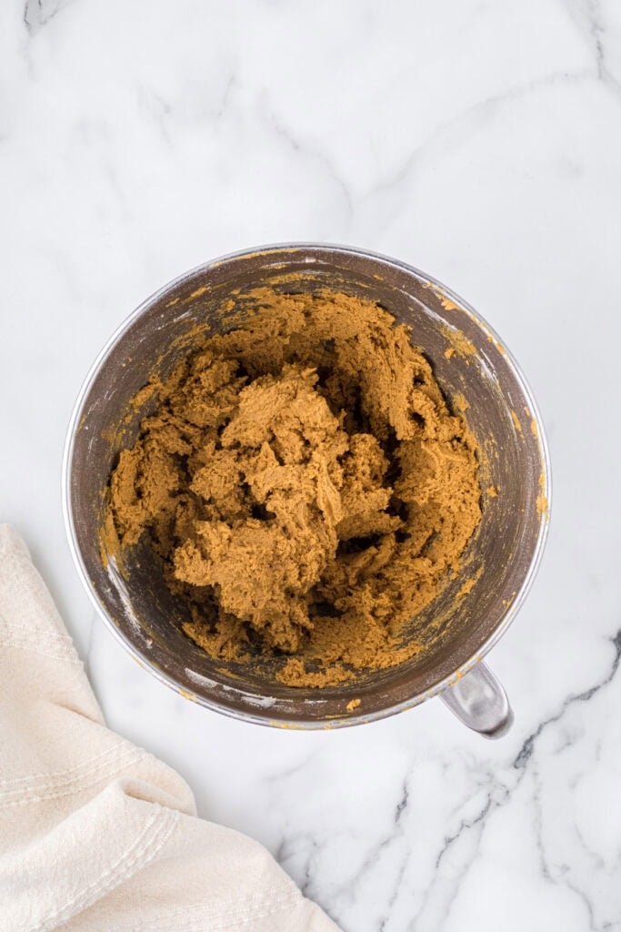 Step 2. In a small mixing bowl, whisk together flour, baking soda, cinnamon, ginger, cloves, nutmeg, and salt until just mixed. Add the flour mixture to the dough, mixing until just combined. Scrape down the edges of the bowl with a spatula to ensure the dough is evenly mixed.
