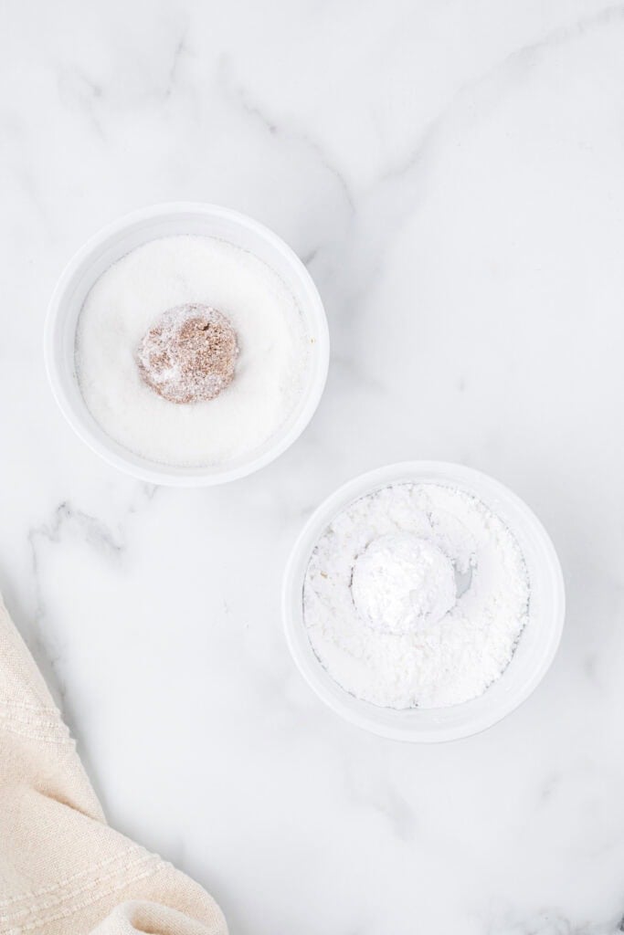 Step 3. Refrigerate dough for at least one hour. Scoop 2 Tablespoons of cookie dough, I like using a medium-sized cookie scoop for this, and roll into a ball. Roll in granulated sugar, then in powdered sugar and place on the prepared cookie sheet.