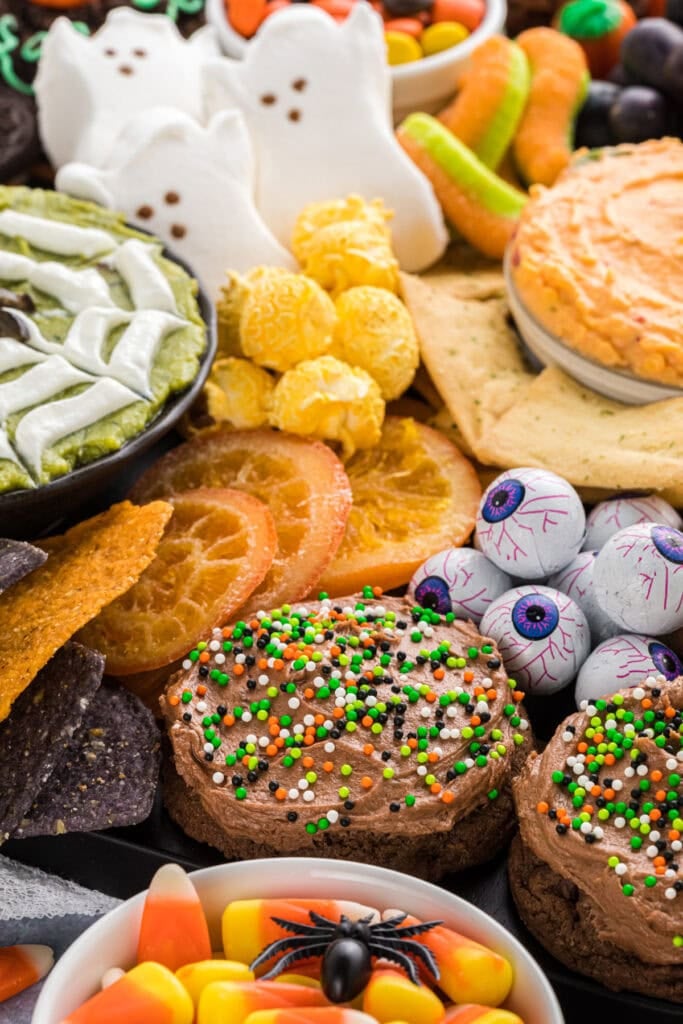 - Feel free to fill the board with different Halloween snacks and treats. Again, I was going with Halloween colors, so some other options could be: Cheez-its or Goldfish crackers, cubed cheese, green olives, dried mangos, mandarin oranges, a popcorn mix, or other Peeps marshmallows. Halloween trick-or-treat candy is a fun filler as well.