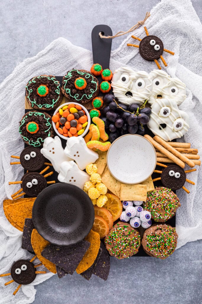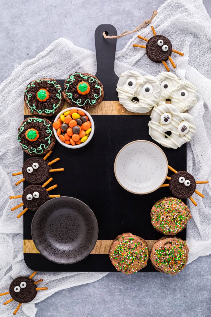 These recipes are all included in this charcuterie board: Pumpkin Patch Cookies, Chocolate Frosted Cookies, Mummy Pretzels, and Oreo Cookie Spiders.