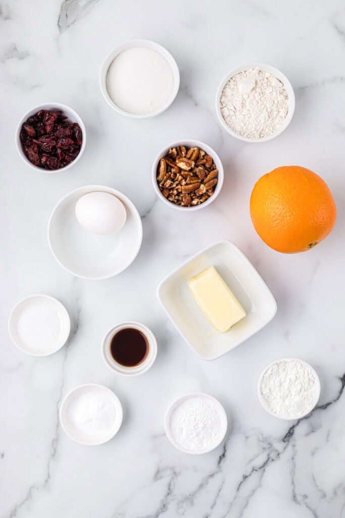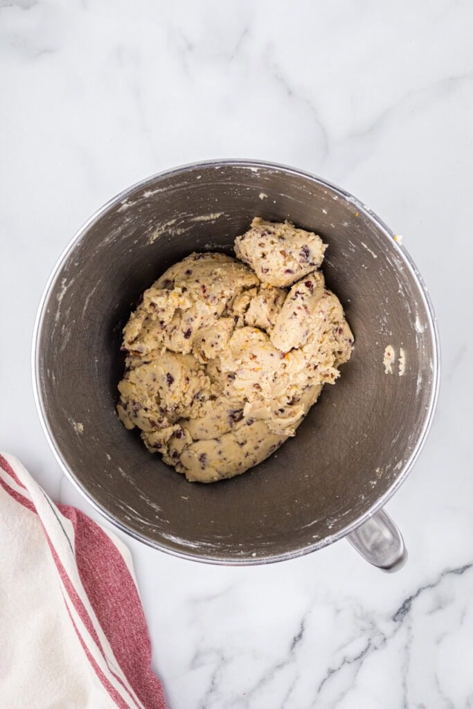 Step 3. Add the flour mixture to the sugar mixture and mix at low speed just until combined, being careful not to overmix. Scrape down the sides of the mixture to make sure all ingredients are incorporated. Mix in the dried cranberries, pecans, and orange zest