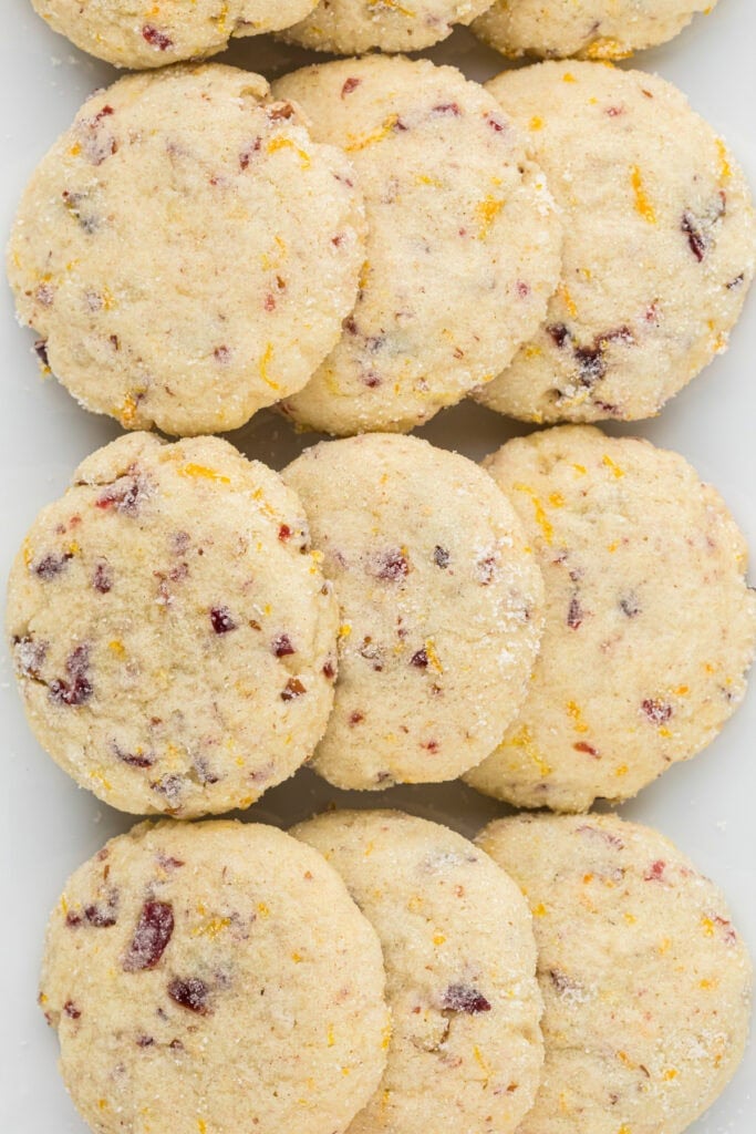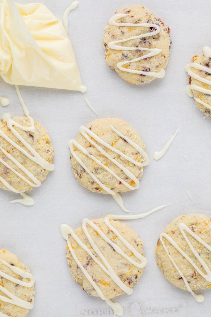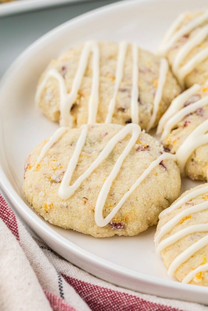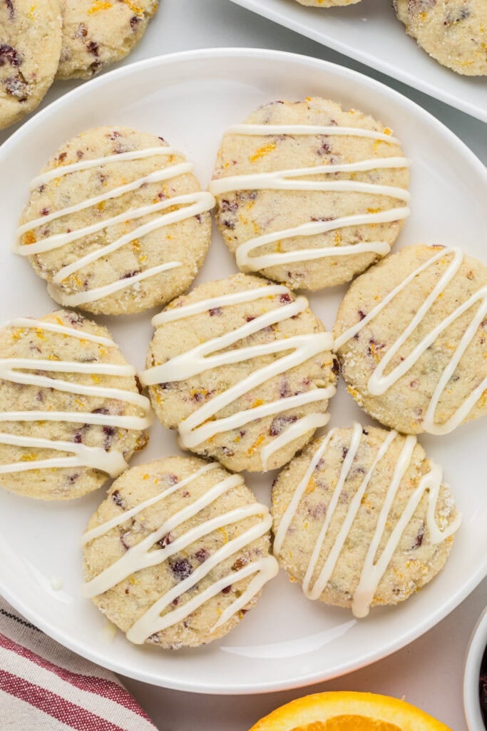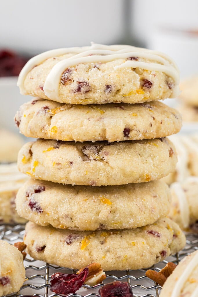 These cookies are the most flavorful cookies, ever! Studded with cranberries, pecans, and orange zest, then rolled in orange sugar and drizzled with orange icing, they are so flavorful and so delicious. I love including these with holiday gifting because they are a pretty, colorful cookie with holiday flavors that bring contrast and balance to a holiday cookie plate.