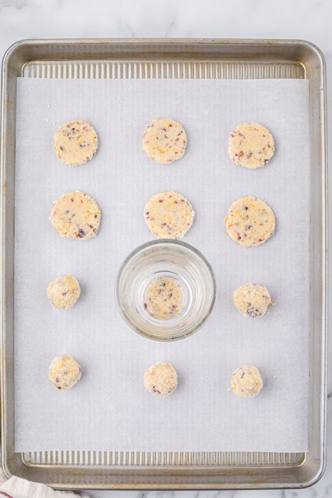 Step 4. Using a small cookie scoop (about 1 tablespoon of dough), scoop the dough and roll into 1-inch balls, then roll the balls in the orange sugar. Space the dough 2 inches apart onto the prepared baking sheets. Using the bottom of a cup, flatten each ball into a 1 ½ inch circle.