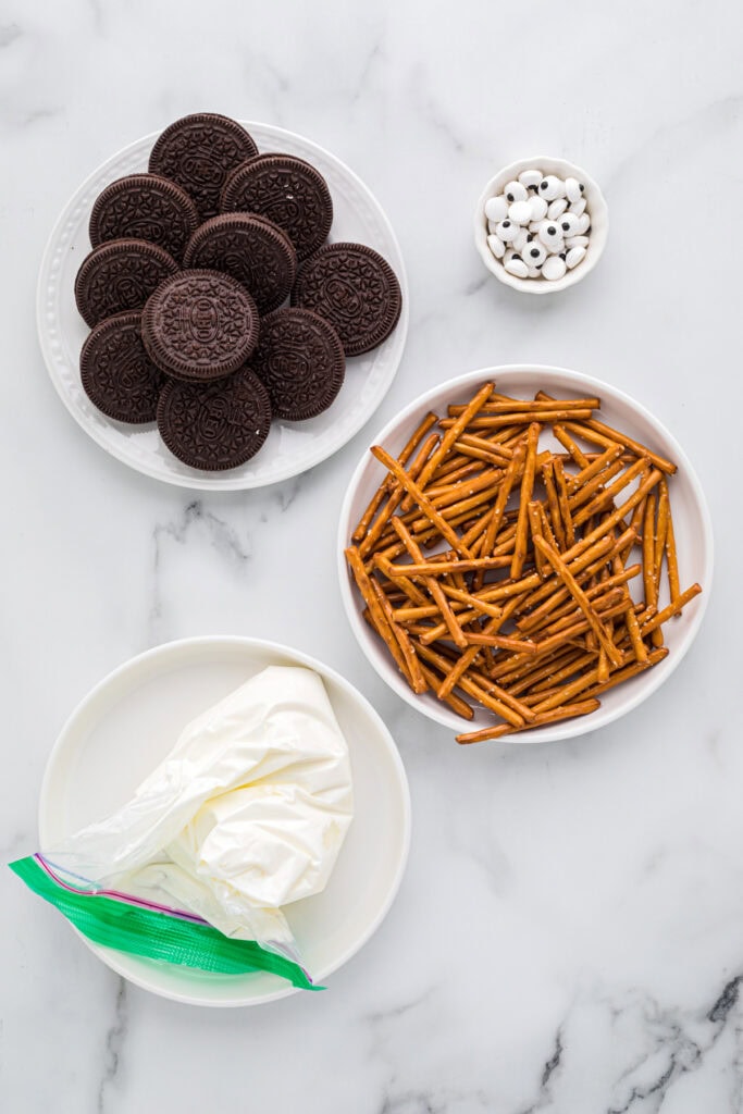 Step 2. Once the eyes are in place, carefully remove the top cookie and place the halved pretzels in the filling. (I like to do 3 on each side, but you can do four.) Gently press the top Oreo in place and serve.