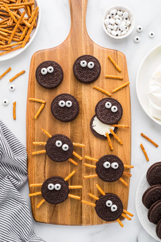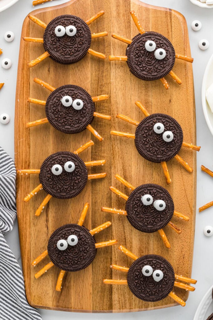 Kids love helping make these, and they really are so cute! They are fun to make and eat, and they are a huge kid-friendly treat. They are perfect for Halloween parties, class treats, or after-school snacks, and I think they are adorable on a Halloween charcuterie board. The spiders with their eyes have their own little personalities and always bring a smile to those who see them.