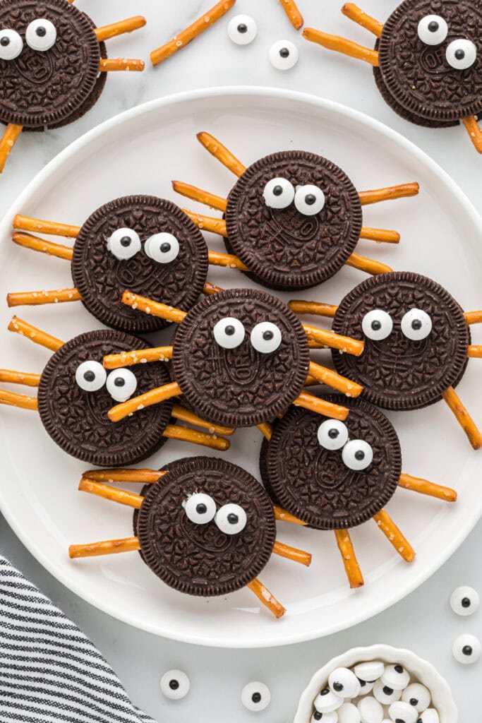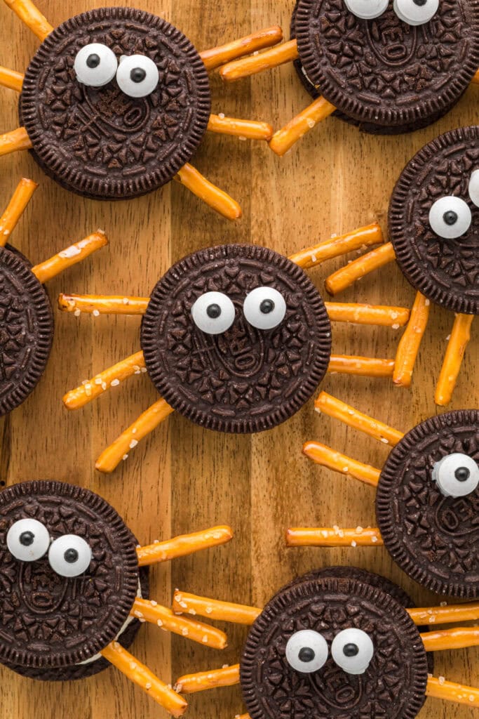 I love how simple these Oreo cookies are to make! I use frosting or melted white chocolate to “glue” on the eyes, and just take off the top of the cookie to add the legs, and then replace the top cookie to finish. These are definitely easier to make with double-stuff Oreos. I have made them with regular Oreos, they they just don’t stay together as well.