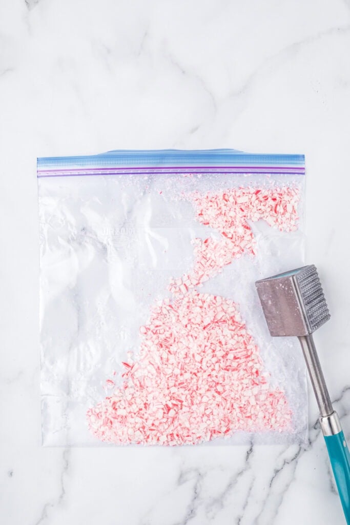 Step 1. Put the unwrapped candy canes in a gallon-sized Ziploc bag and crush finely with the flat side of a meat tenderizer or a rolling pin.