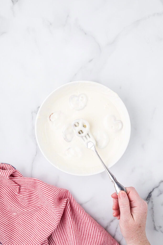 Step 2. Melt the white vanilla wafers according to package directions. Place 5-6 pretzels at a time in the melted chocolate. Working one at a time, use a fork to turn a pretzel and ensure that the entire pretzel is covered. Lift the pretzel with the fork and let the excess white chocolate drip into the bowl. Place it on the prepared baking sheet. Repeat the process to coat 25 pretzels. Repeat the process with the dark chocolate.